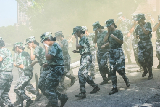 在疏散演练指令下达后,东校区风雨运动场、西校区体育训练室内烟雾腾起,警铃骤响,数千名学生从应急疏散通道用湿毛巾捂住口鼻,弯着腰,俯身沿着学校指定应急通道紧急撤出。参与演练的疏散引导人员驻守各个通道口,维持现场撤离秩序,防止发生拥挤现象,并了解参加演练的学生可能存在的逃生心理反应,提醒同学们不要慌,不要急,注意安全,规范有序的撤离到安全区域。